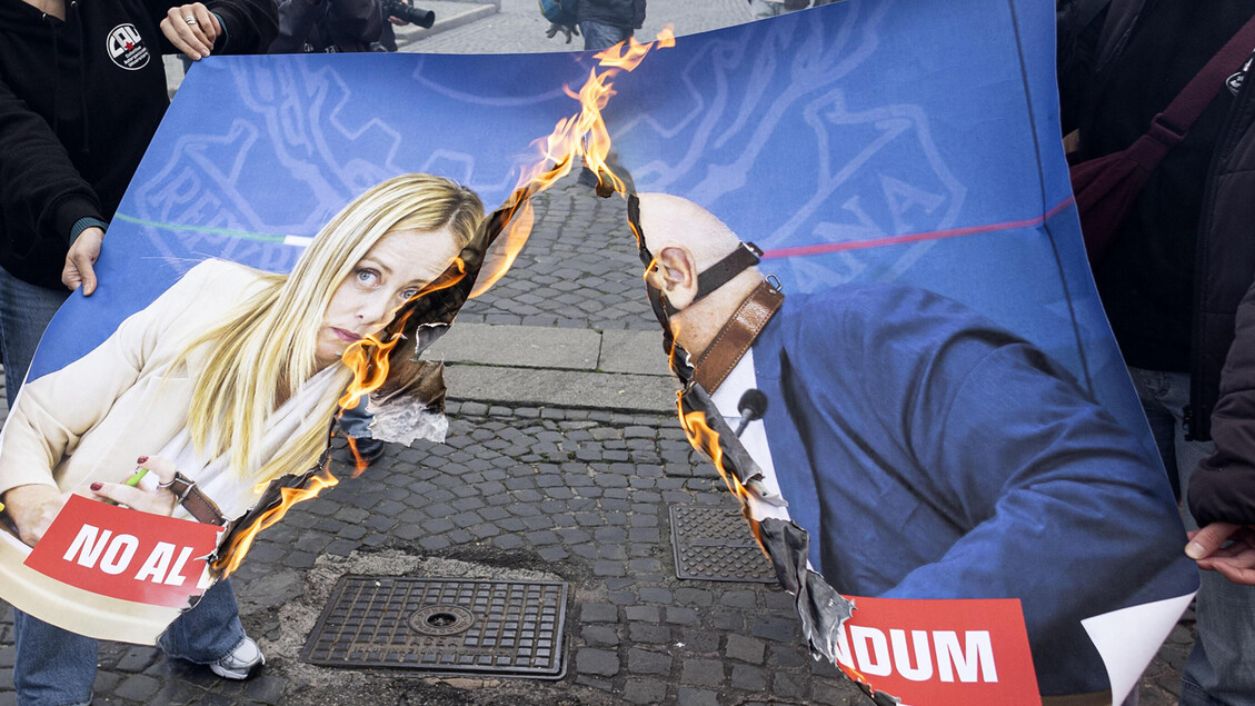 Al corteo bruciate foto di Meloni, scontro totale sul referendum